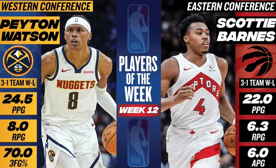 NBA官方公布了第12周的东西部周最佳球员,东部由猛龙前锋巴恩斯当选,西部由掘金后卫沃特森当选。巴恩斯上周场均贡献22分+6.3篮板+6助攻,带领猛龙取得3胜1负的战绩。据统计,这是巴恩斯生涯第2次拿到该奖项。沃特森上周场均砍下24.5分+8篮板+4助攻+1.3抢断+1.8盖帽,三分球命中率高达70%,带领掘金队取得3胜1负的战绩。据统计,这是沃特森生涯首次获此殊荣。除此之外,布伦森、大帝、加兰、杰伦约翰逊、内姆哈德、阿夫迪亚、布克、华子、SGA和小卡等球星获得了周最佳提名。