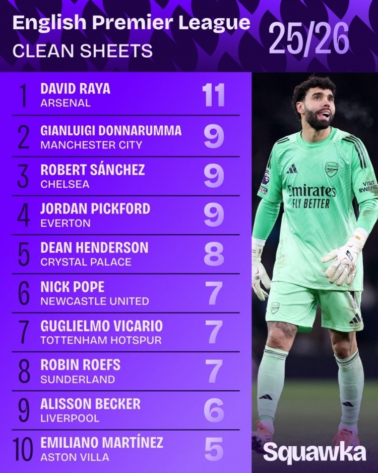 在本赛季的门将零封场次榜上,曼城门将多纳鲁马、切尔西门将罗伯特·桑切斯和埃弗顿门将皮克福德以9次零封位列二至四位。